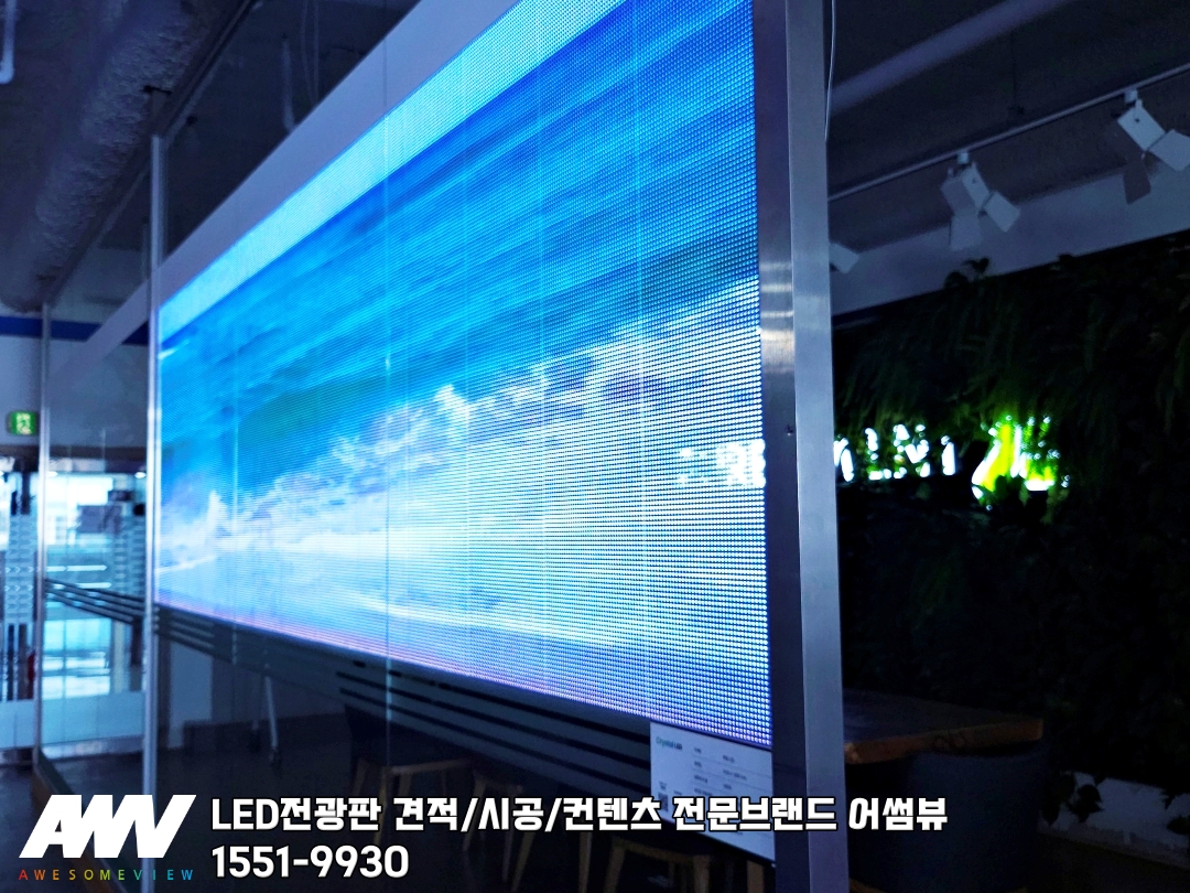 어썸뷰 사무실 내부에 회의실과 사무공간을 구분하는 통유리에 픽셀피치 6P 제품을 설치 하였습니다.